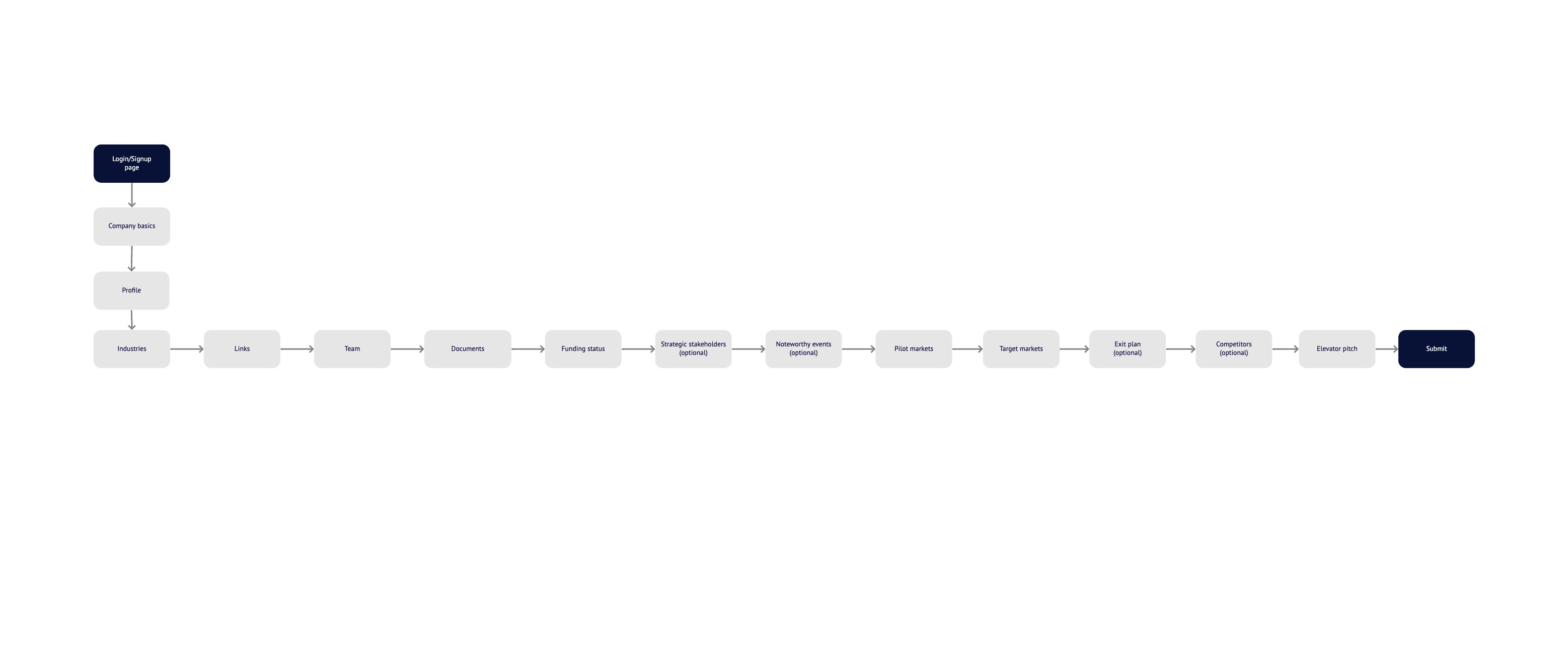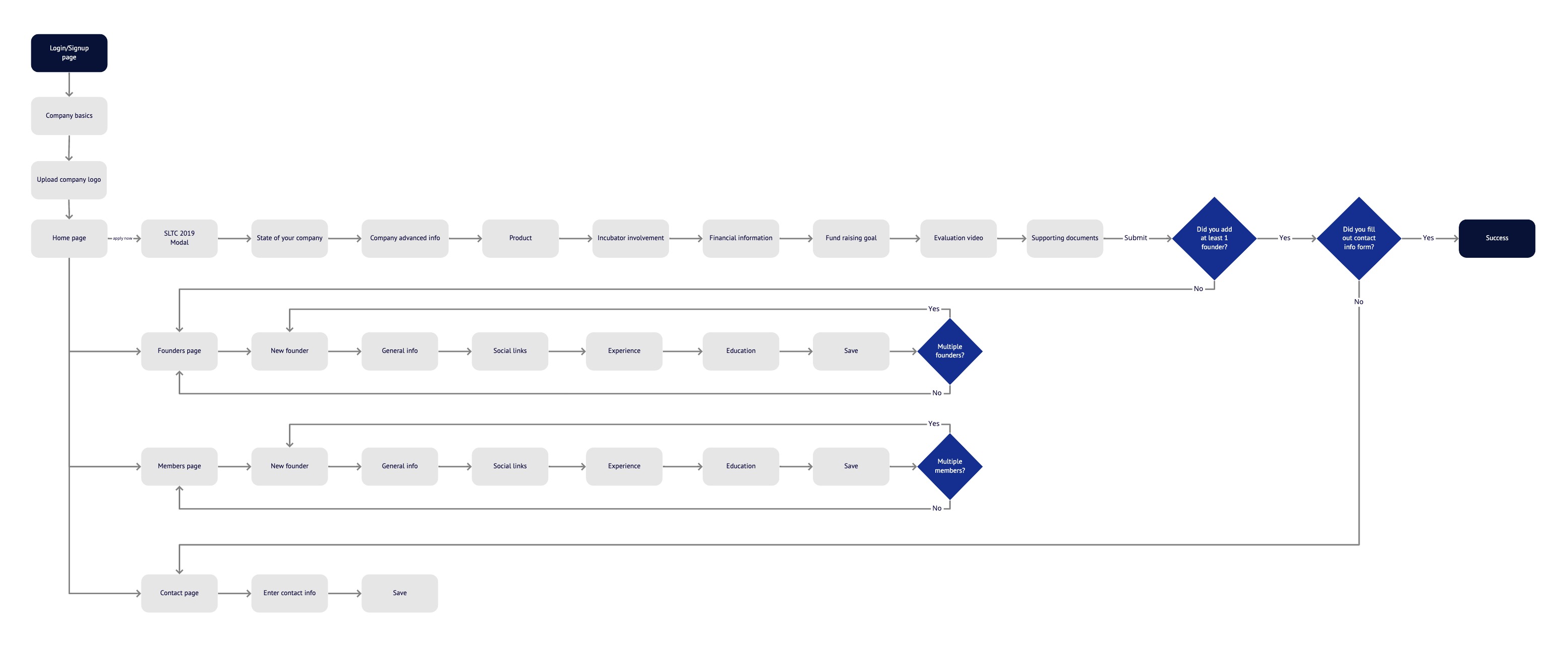 After exploring several concepts, a linear approach performed best in user research and was preferred by Irbis Ventures’s executives. Instead of a constantly going back and forth, one page could house mini-flows so users could complete all necessary steps without leaving the Onboarding page. This set clear expectations up front about what was necessary to participate in SLTC 2020